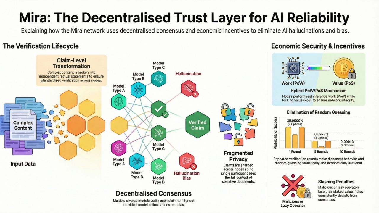 Согласно @Mira - Trust Layer of AI докладу, $MIRA преобразует выводы ИИ в более мелкие, независимые требования. Например, длинный абзац разбивается на четкие фактические утверждения. Каждое утверждение затем отправляется разным узлам-проверяющим. Эти узлы проводят свои собственные выводы и представляют суждение. Сеть агрегирует ответы и производит консенсусный результат.