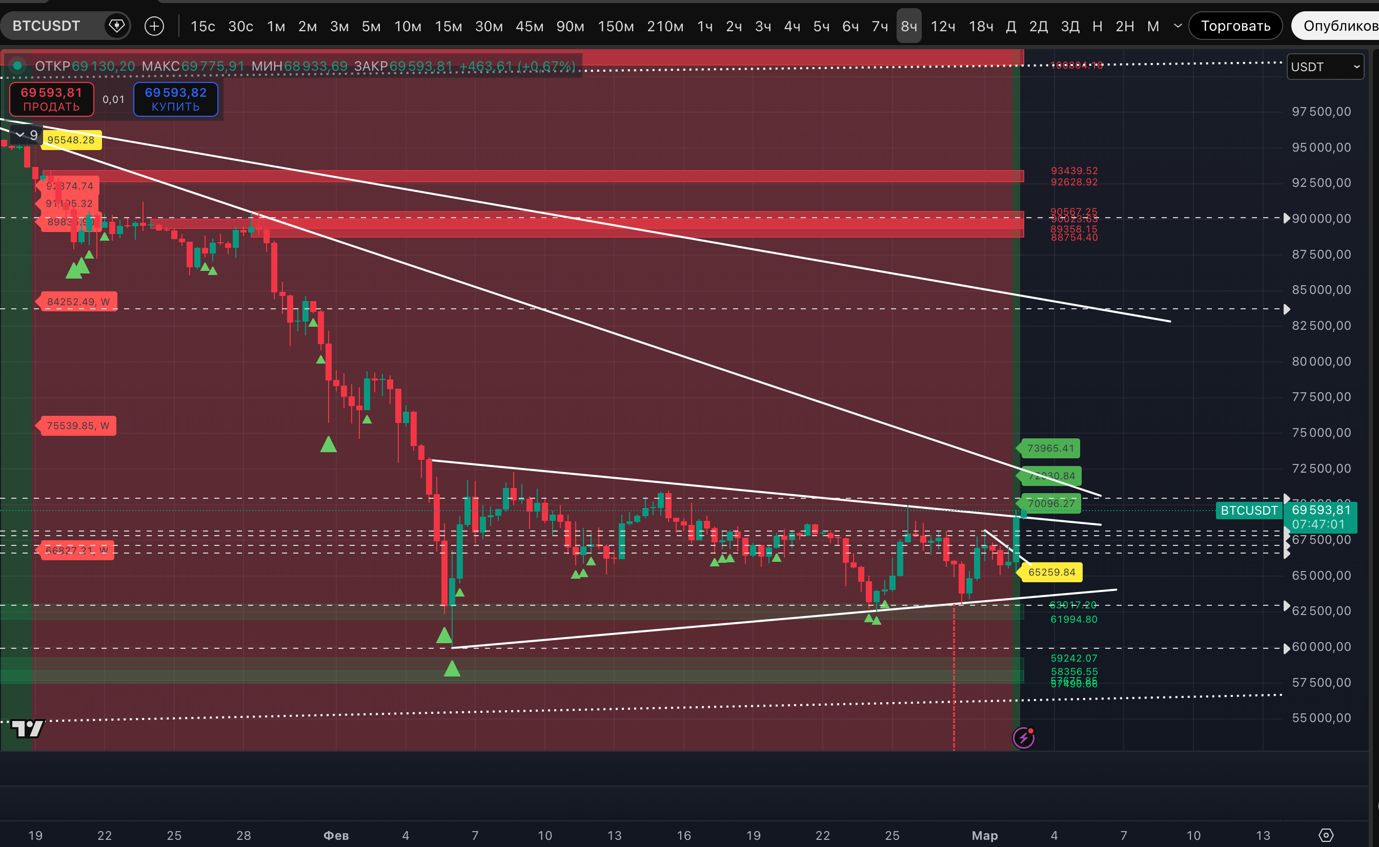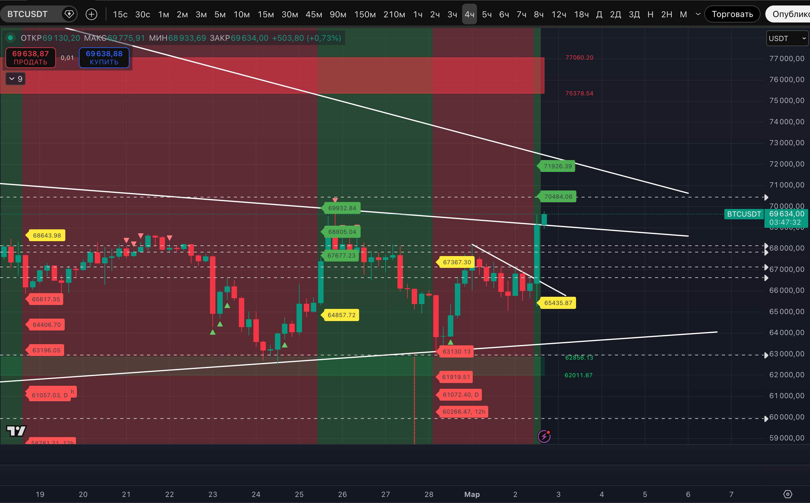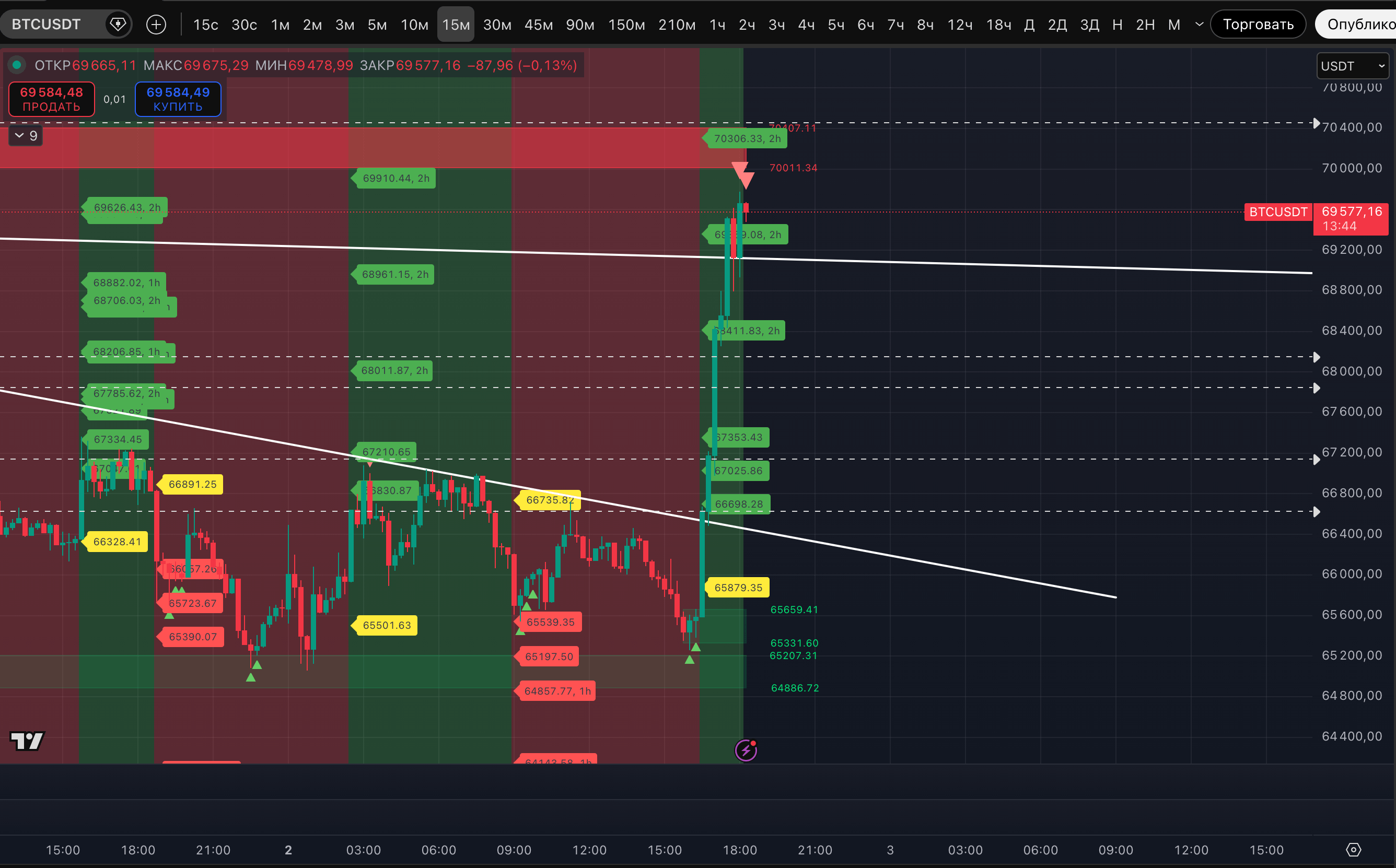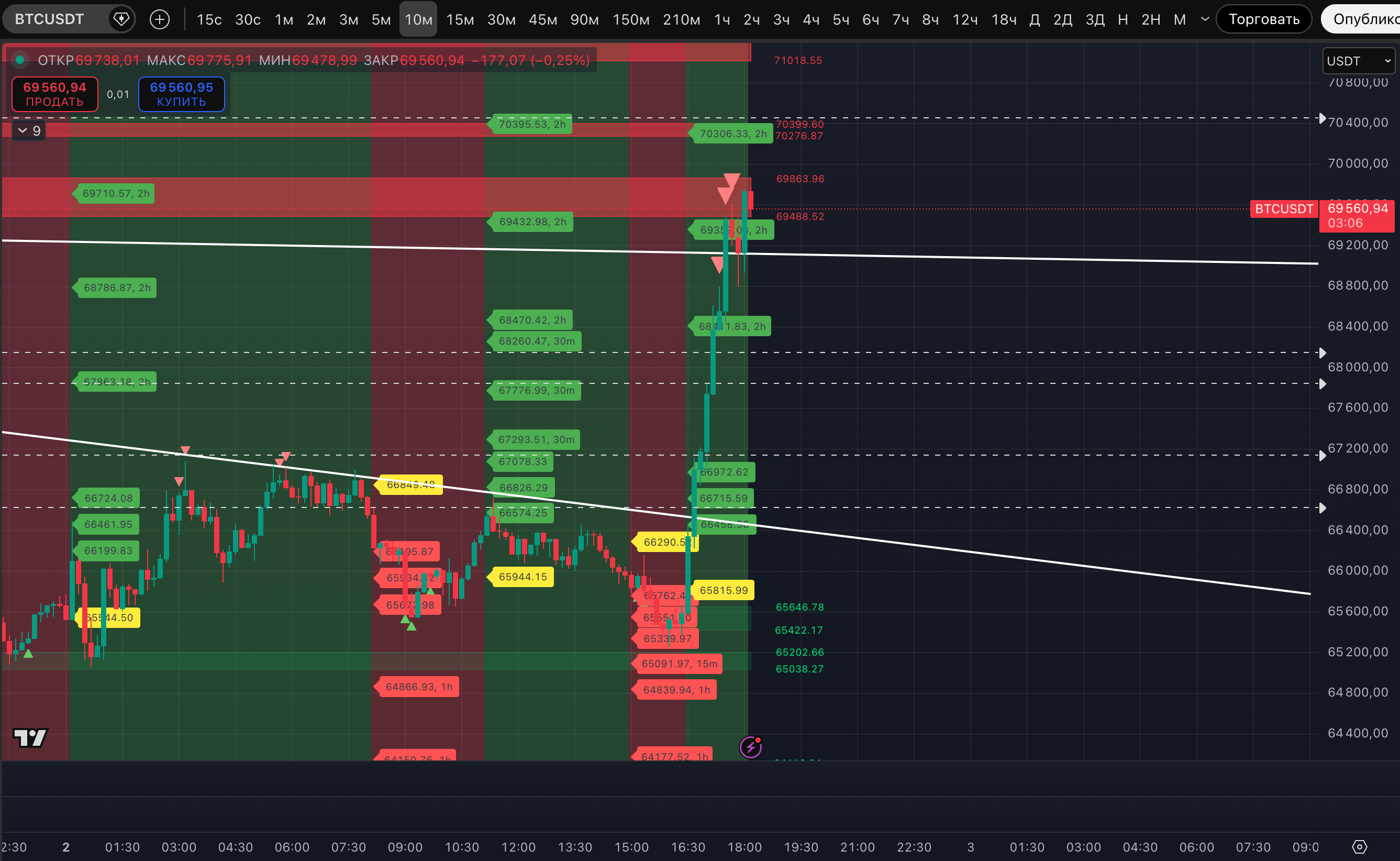 Пока ближайшая зона ликвидности по тренду, вверху - это, как и указывали, 70 181-70 550$. Там же в зоне горизонтальный уровень 70 286$.