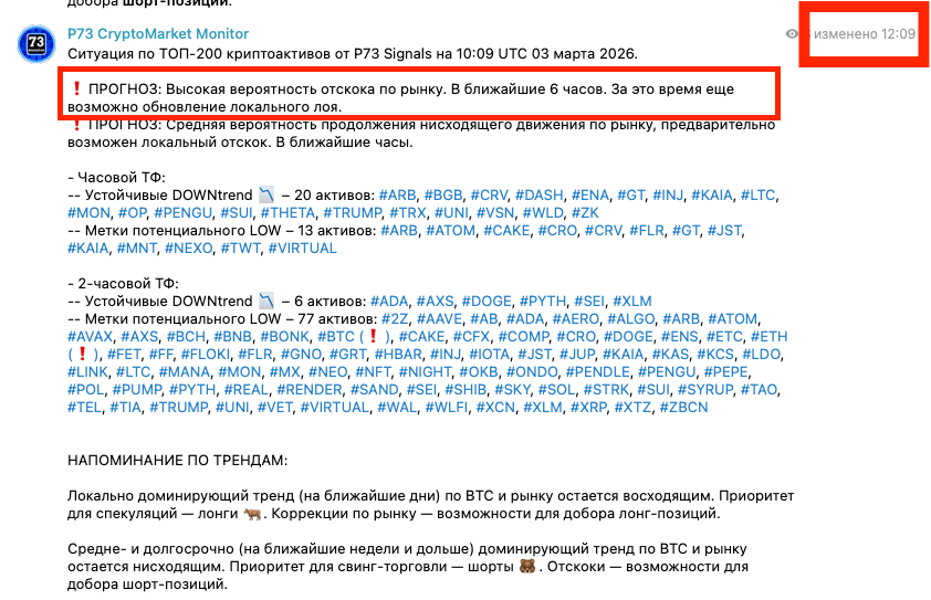 По P73 CryptoMarket Monitor. На прошлой неделе мы, как и обещали, доработали уведомления по краткосрочным, средне-/долгосрочным трендам рынка. Как уведомления о факте смены тренда, так и напоминания о том, какие тренды актуальны в момент новых авто-прогнозов. На этой неделе плотно занимаемся уточнением авто-прогнозов, подвязывая их под контекст трендов. Вариаций станет как минимум в два раза больше, точность авто-прогнозов повысится.