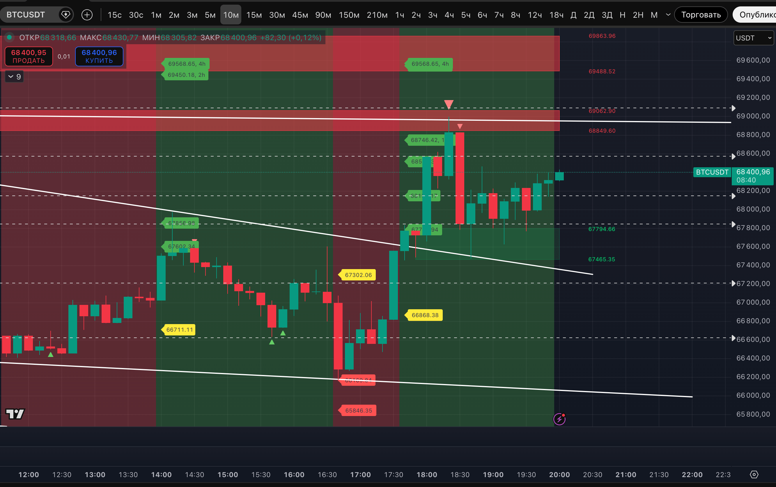 Сейчас для быков важно пробивать трендовую, и она как раз проходит через зону ликвидности 68 849-69 062$, которую сейчас защищают медведи. Рост уперся именно в нее, от этой зоны, показав Strong signal хая на 10-минутном ТФ, цена сегодня и показала откат к ближайшей зоне ликвидности внизу - 67 465-67 794$. Сполна ее оттестировав тенью свечи.