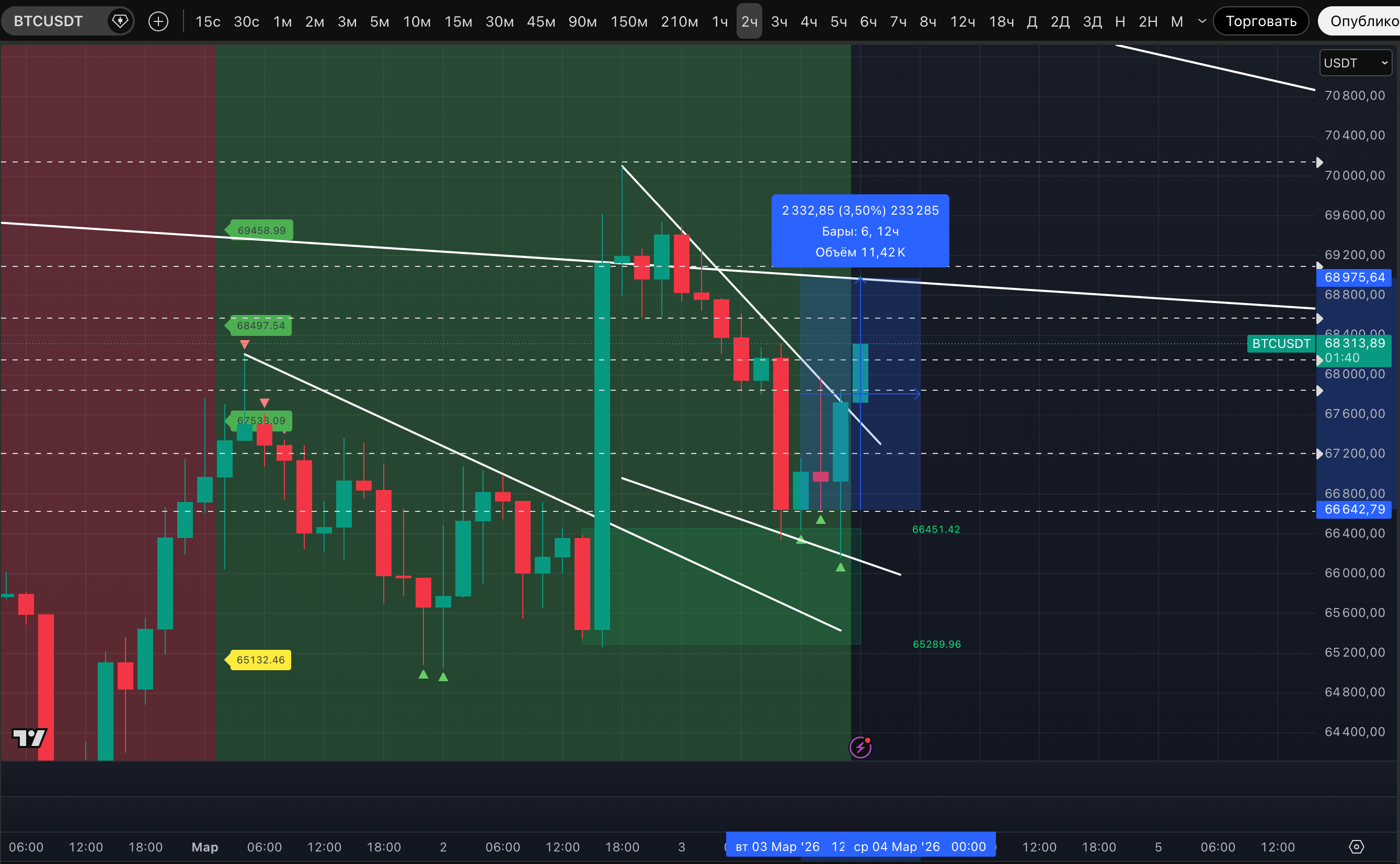 В моменте достигнув 68 999$, цена уперлась в трендовое сопротивление (верхняя трендовая злополучного для быков "Медвежьего вымпела") и откатилась. Но пока покупателя явно давят.