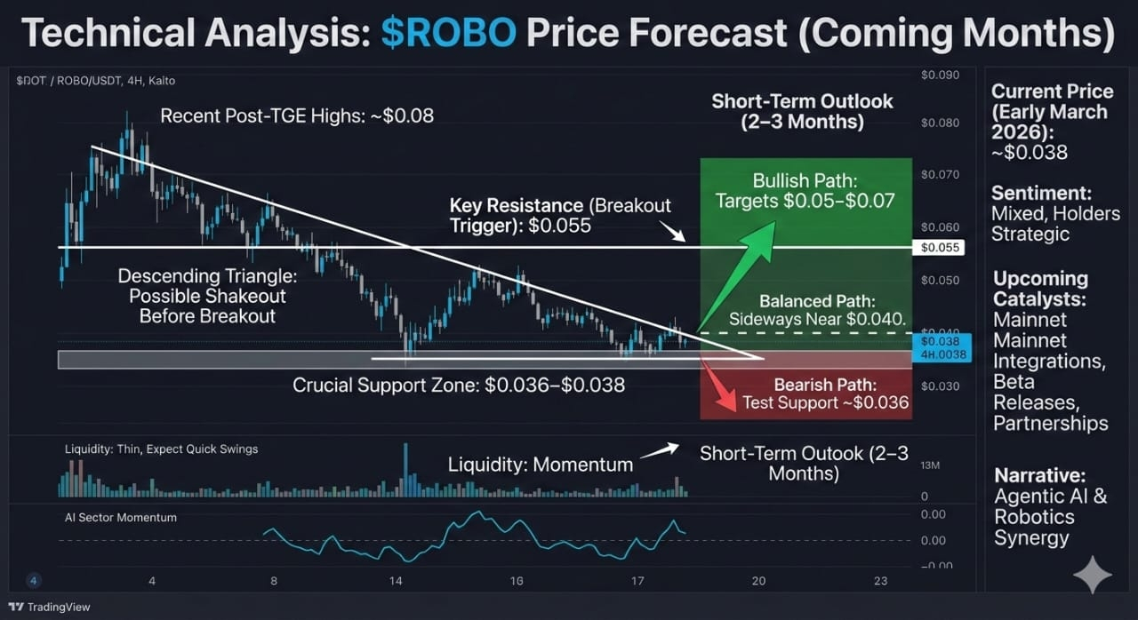 As of early March 2026, $ROBO is trading around $0.037–$0.040, down from its initial post-launch highs. The charts show a descending triangle, hinting at a possible shakeout before a breakout toward $0.07 if resistance at $0.055 gives way. Personally, I see these dips as opportunities rather than red flags especially for a token this new. Short-term bearish pressure is natural, but early-stage tokens often move sideways before finding their groove.