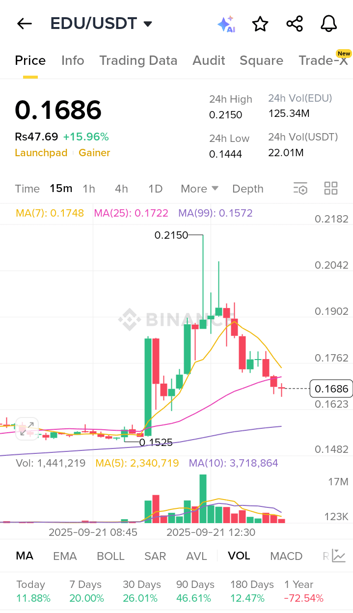 $EDU сегодня показывает сильный импульс, цена в данный момент составляет $0.1686, увеличившись на +15.96% за последние 24 часа. 🚀