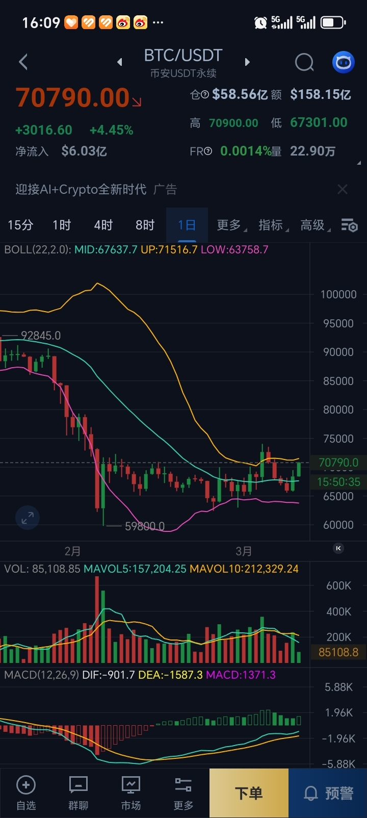 - 当前价格:70790 USDT,单日涨幅 +4.45%,资金净流入 6.03亿 USDT,短期多头情绪较强。