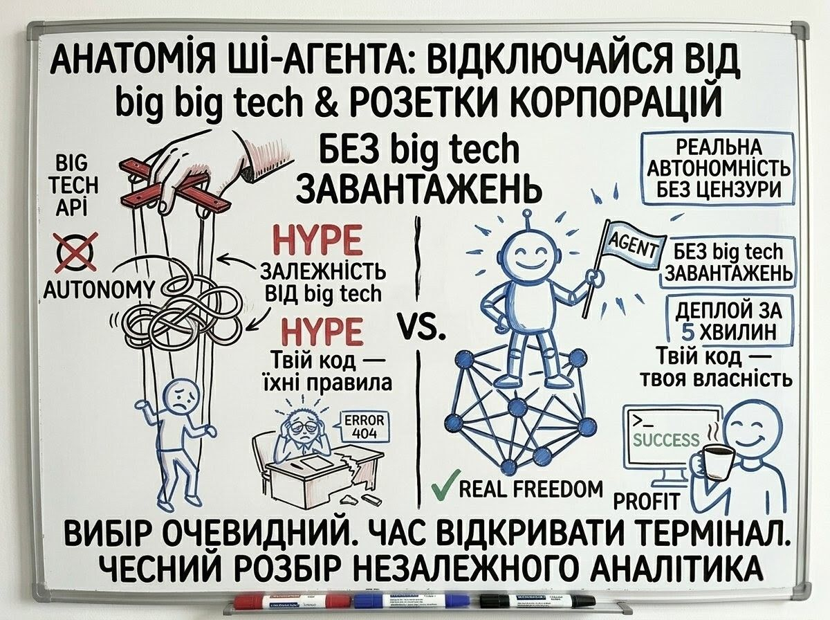 Ми звикли бути цифровими кріпаками. Ми будуємо бізнеси на піску, сподіваючись, що корпорації дозволять нам і далі юзати їхні моделі. Але справжня автономність — коли твій агент живе в децентралізованій мережі, а не в хмарі, яку можуть вимкнути за один твіт.
