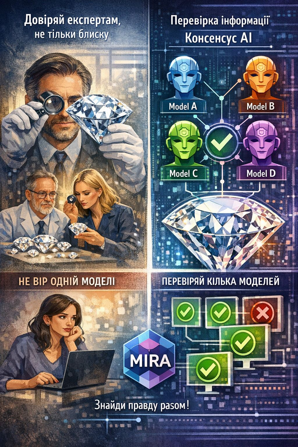 @Mira - Trust Layer of AI напоминает этот принцип. Только тут вместо алмазов — информация. А проблема та же. ИИ умеет создавать красивые ответы, которые выглядят как правда. Блестящие. Убедительные. Но действительно ли они настоящие?