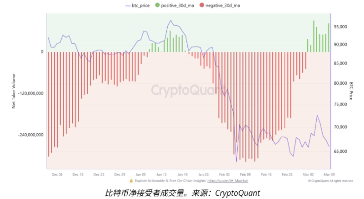 Другой показатель локализации также изменяется в том же направлении. 30-дневная скользящая средняя чистого объема заявок на покупку биткойнов в марте остается на уровне 83 миллионов долларов, что свидетельствует о росте активности покупок через рыночные ордера.