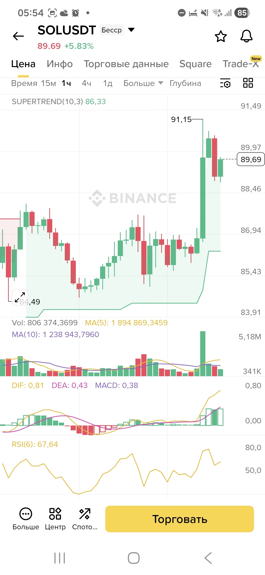 Вижу закономерный откат после роста. Захожу в шорт от отметки 91.60.