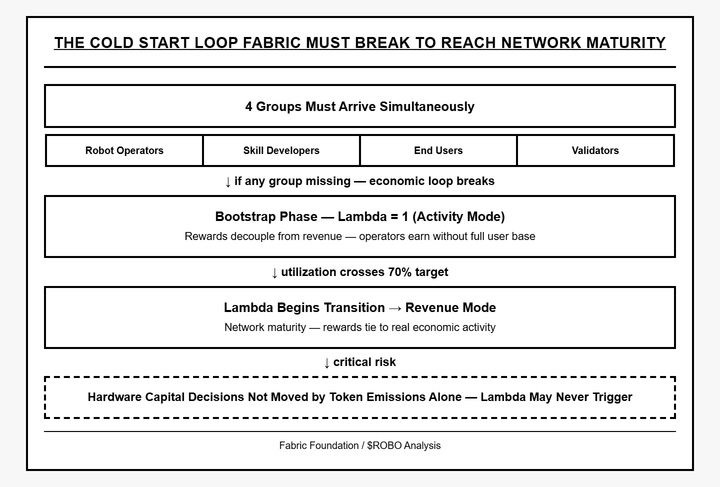 the three bootstrap mechanisms are genuinely sufficient to attract the quality and scale of operators needed to demonstrate real network utility — or if Fabric enters a prolonged cold start phase where token incentives attract small operators, activity metrics look healthy on-chain, but revenue remains near zero and the lambda transition from activity to revenue weighting never actually triggers.