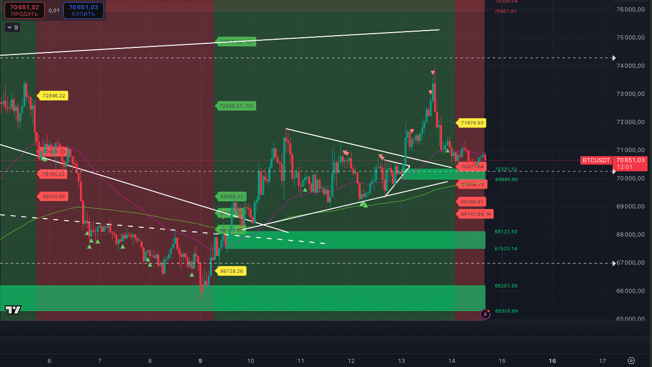 Сейчас цена направляется к тесту 70 452$. Важно следить за ТФ старше часового.