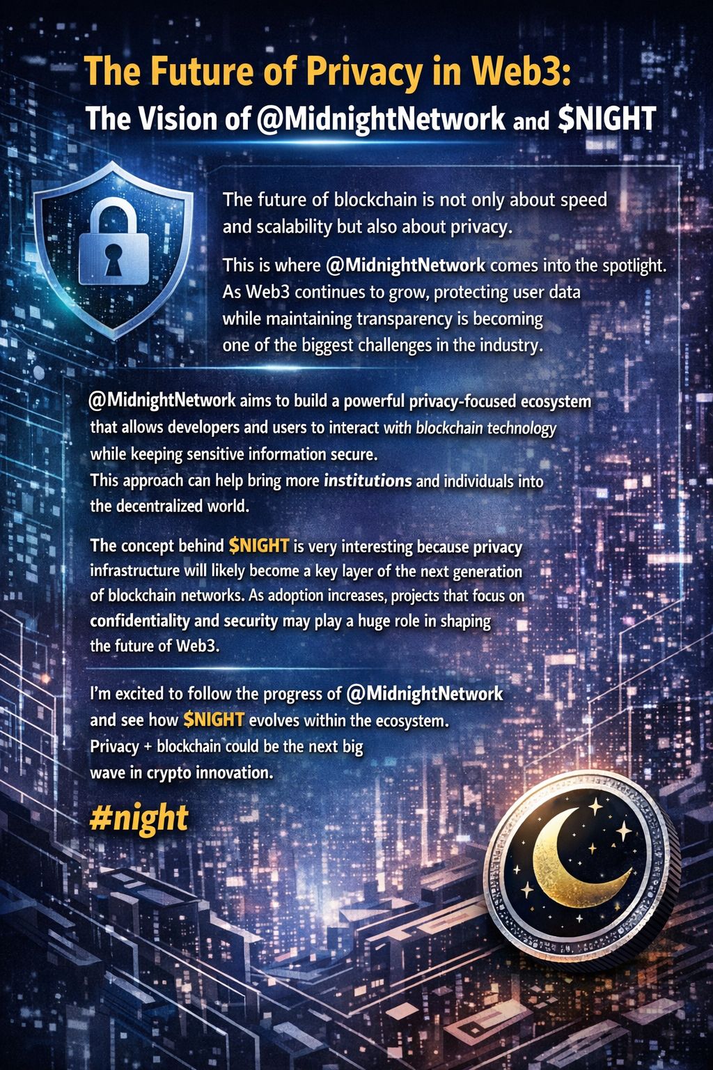 I'm excited to follow the progress of @MidnightNetwork and see how $NIGHT evolves within the ecosystem. Privacy + blockchain could be the next big wave in crypto innovation.