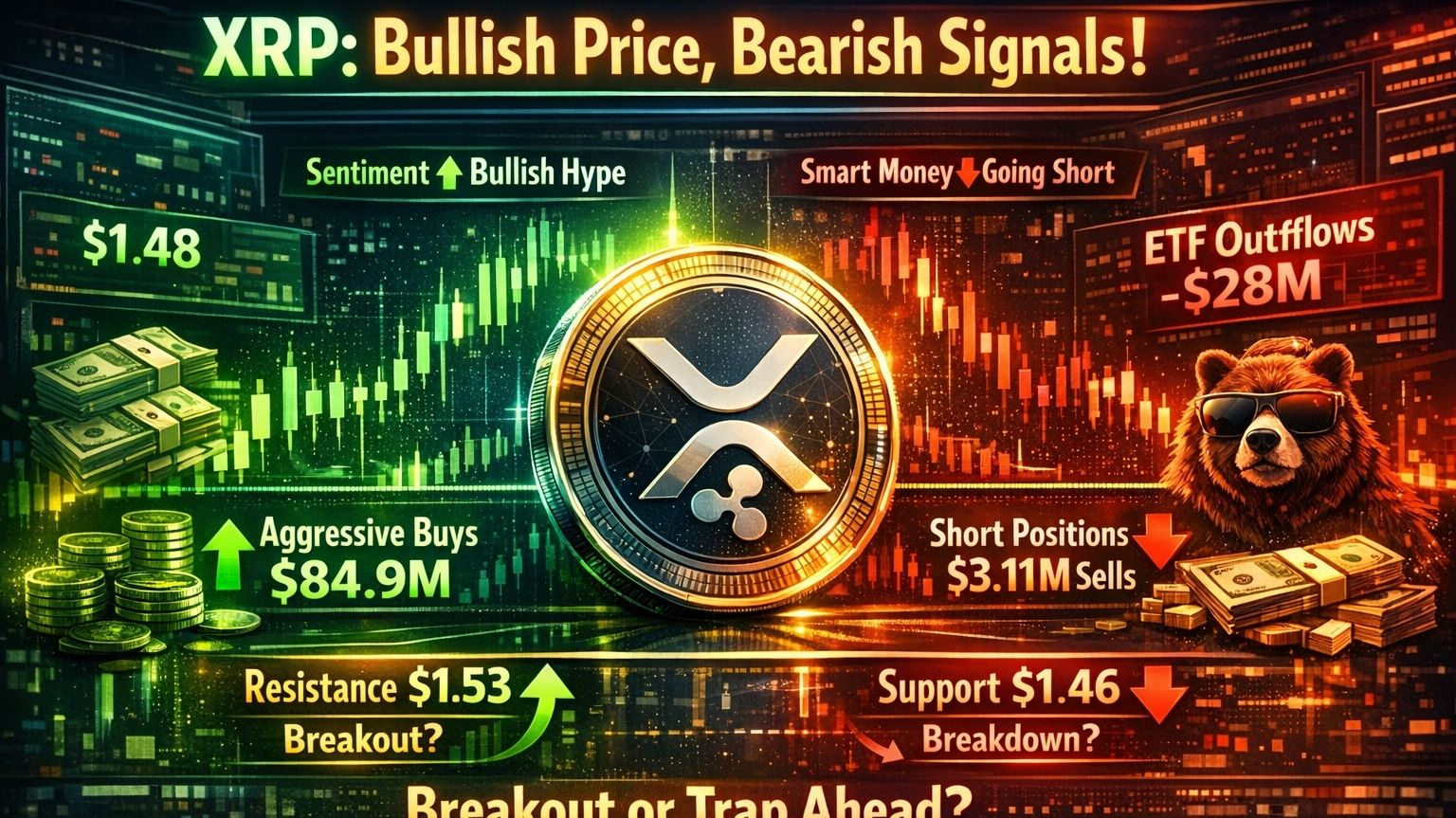 $XRP тихо поднялся сегодня, поднявшись примерно на 4.4% до $1.48, и на первый взгляд этот шаг выглядит как сильный импульс, возвращающийся на рынок. То, что привлекло мое внимание больше, чем сама цена, это капиталовложение за этим движением. Примерно $84.9M в агрессивных покупках вступили в игру, превосходя около $73.9M в продажах. Такой дисбаланс обычно означает, что покупатели готовы платить больше, а не ждать более дешевых входов.