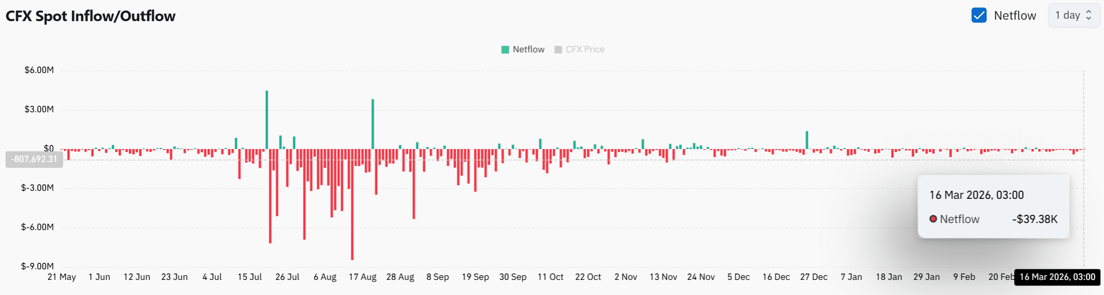 Деятельность по спотовым потокам показала постоянные негативные чистые оттоки с бирж, указывая на то, что CFX продолжал покидать торговые платформы. Последний зарегистрированный чистый отток составил примерно –$39,38K, что усиливает текущую тенденцию оттока, наблюдаемую в последние недели.