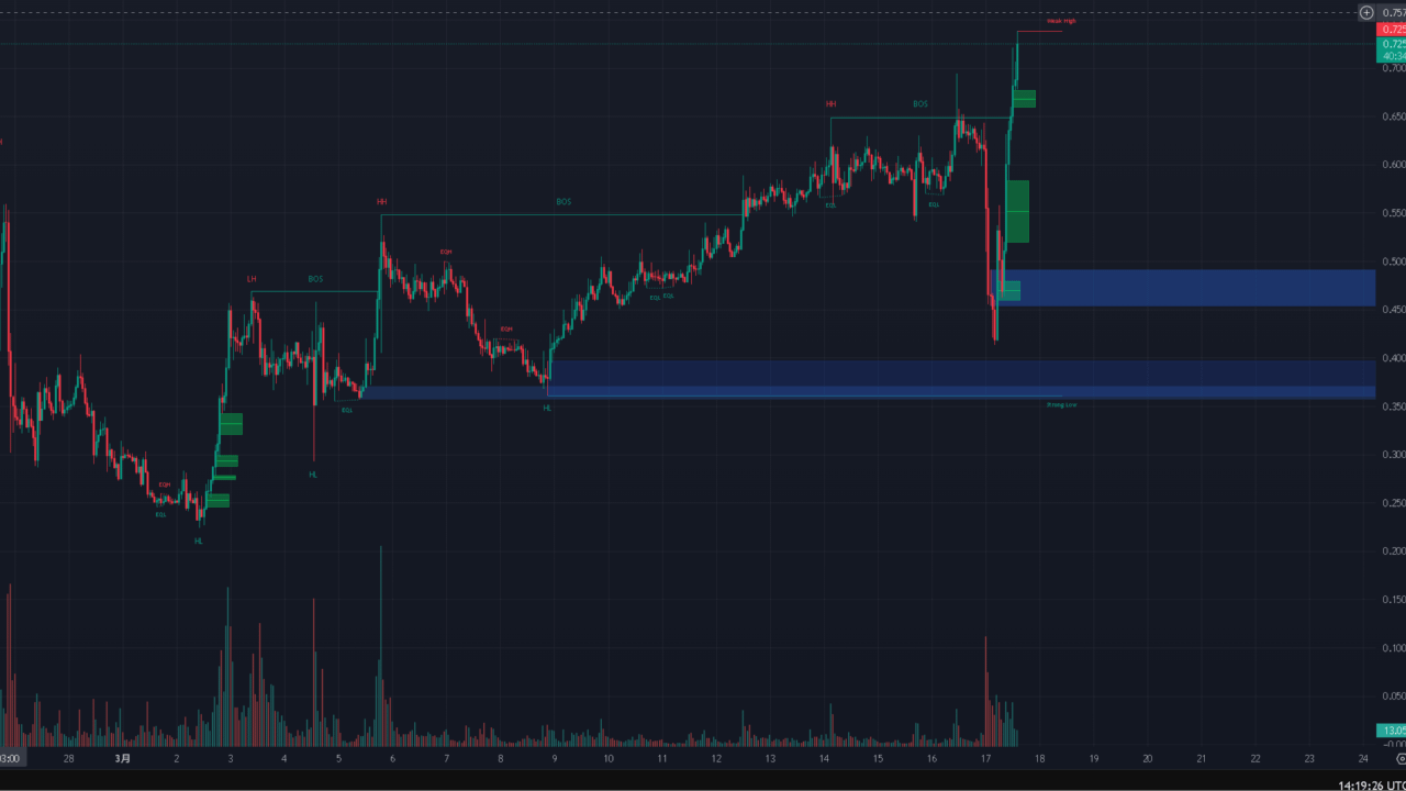 Риск фиксации прибыли: цена приближается к историческому максимуму (около 0.69 долларов 16 марта), высокая вероятность реализации краткосрочных прибылей, что может вызвать резкую коррекцию.