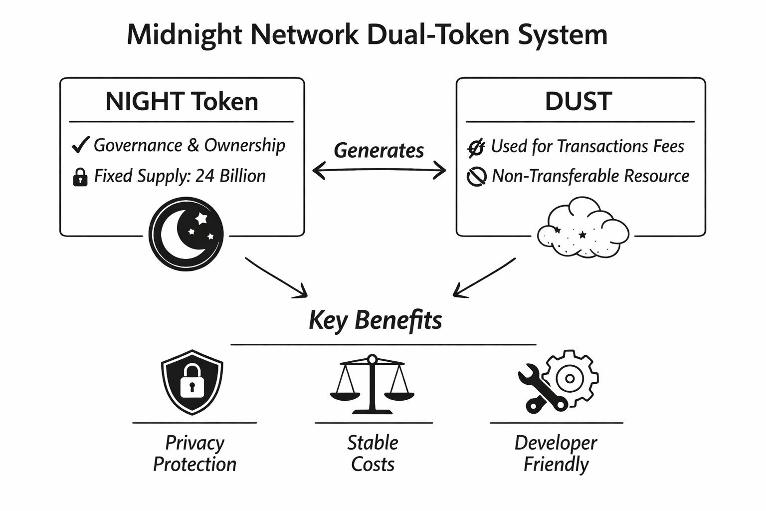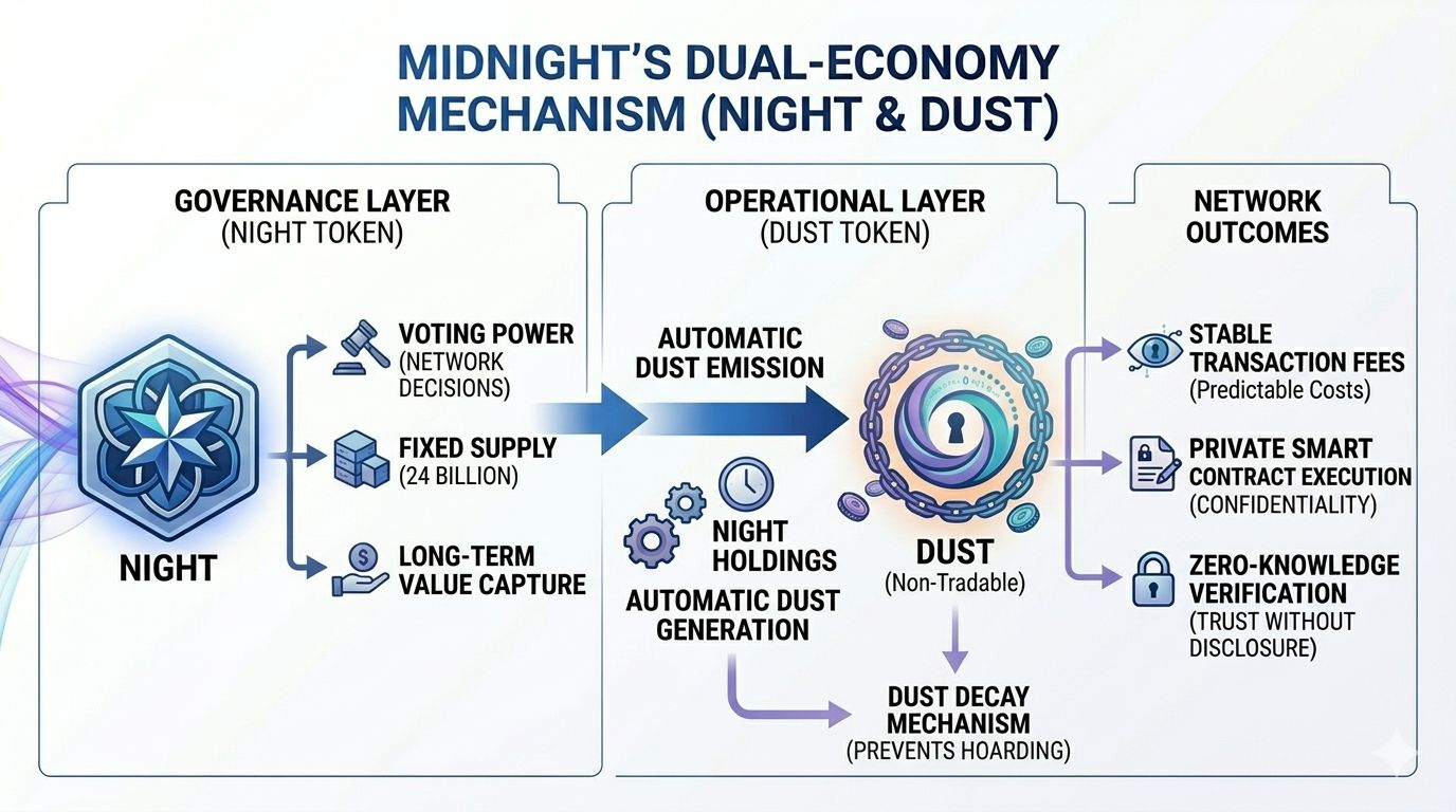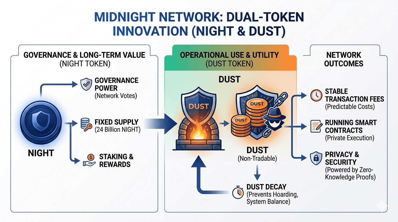 I believe the real magic of Midnight lies in its dual token system. Instead of trying to force one single token to handle every single task on the network they decided to separate governance and daily operations between two distinct assets known as $NIGHT and DUST. In this ecosystem NIGHT represents the governance side and long term ownership of the network while DUST is something that is automatically generated for operational use. This ensures that transaction fees remain private and stable over time. This kind of separation is a game changer because it makes the entire network much more predictable and fair for everyone involved including developers who need to plan their budgets months in advance.