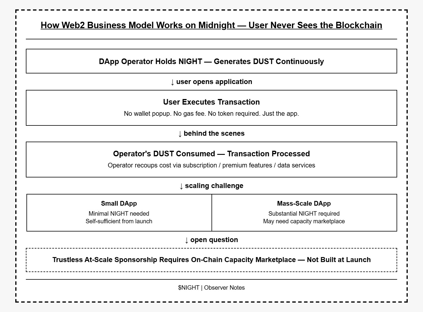 Midnight enables the same model for blockchain applications. a DApp operator holds NIGHT, generates DUST, and covers every user transaction cost. users interact with the application like any Web2 product. the operator builds their business model around the application — subscription fees, premium features, data services — not around requiring users to hold tokens.