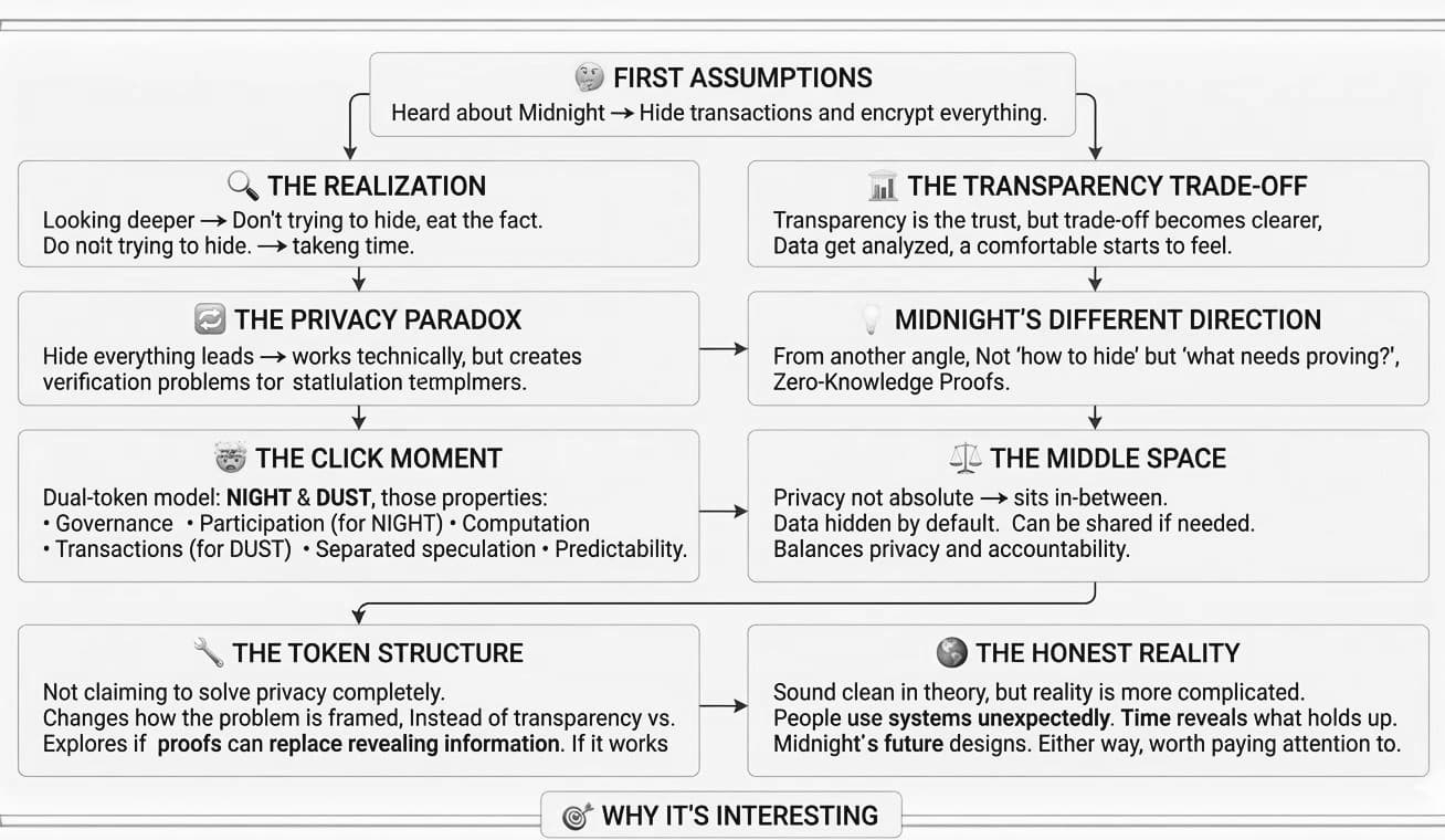 When I first started reading about Midnight, I didn’t expect much. Privacy in crypto has been discussed so many times that most explanations start to sound the same after a while. Usually it’s about hiding transactions or encrypting everything. So at the beginning, I assumed this would follow a similar path.