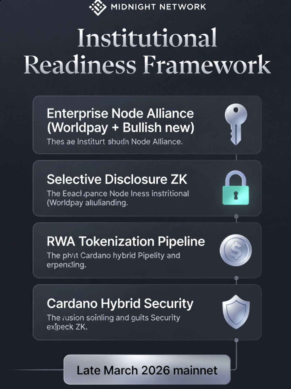 Với việc Worldpay và Bullish chính thức gia nhập liên minh federated node operators ngày 18/3/2026, Midnight Network đã hoàn thiện hơn nữa nền tảng enterprise-grade cho mainnet sắp tới. Nhóm trusted operators hiện bao gồm các tên tuổi hàng đầu: Google Cloud, Blockdaemon, MoneyGram, eToro, Shielded Technologies, Worldpay và Bullish – đảm bảo tính ổn định vận hành và tuân thủ quy định cao nhất trong giai đoạn chuyển tiếp.Kiến trúc programmable privacy với selective disclosure ZK proofs cho phép các tổ chức kiểm soát chính xác mức độ minh bạch dữ liệu, mở ra cánh cửa ứng dụng thực tiễn trong lĩnh vực Real World Assets (RWA). Từ tokenized bonds, private credit đến healthcare records – tất cả đều có thể được triển khai trên Midnight mà vẫn duy trì tuân thủ nghiêm ngặt các tiêu chuẩn KYC/AML.$NIGHT với tổng cung