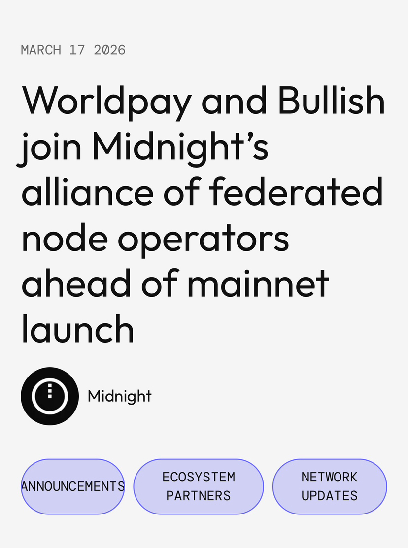 Hôm qua, @MidnightNetwork vừa thông báo Worldpay và Bullish đã join Midnight Network với tư cách là node operator. Mình thấy một insight thú vị ở đây là 2 operator này, mỗi bên đang giải quyết đúng một nửa của cùng một vấn đề "public visibility of transaction data"