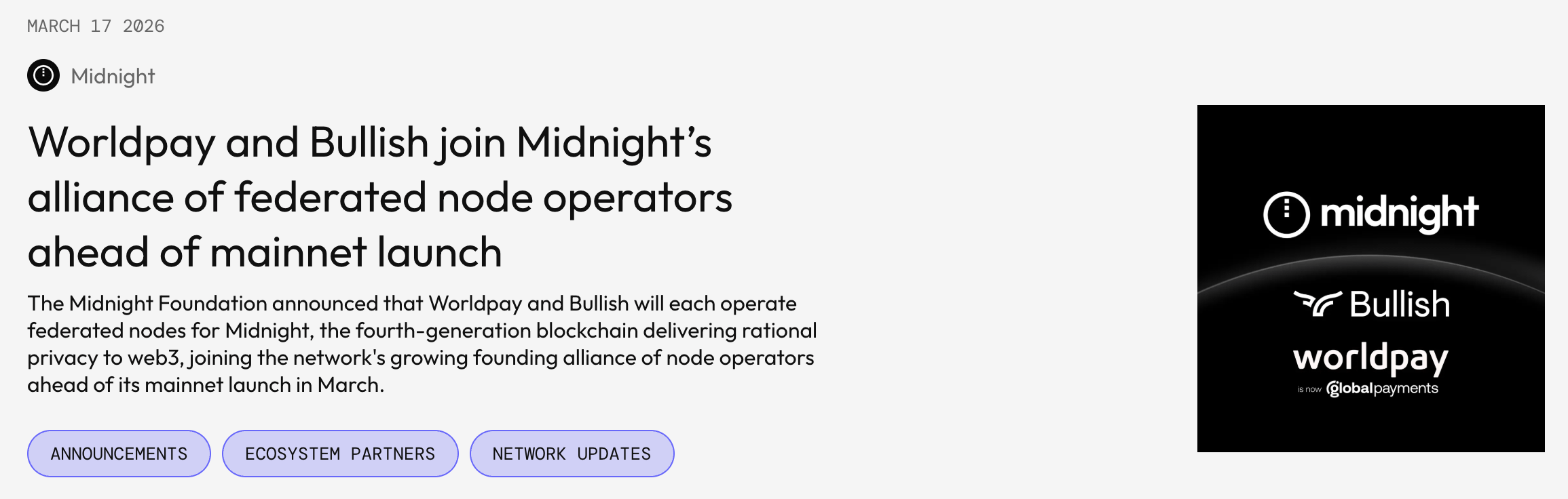 Tính đến thời điểm này, @MidnightNetwork đã confirm 9 founding node operators sẽ tham gia vào mạng lưới bao gồm Google Cloud, Worldpay ($3.7T payments/năm, 6 triệu merchants), MoneyGram (200+ quốc gia), Bullish, eToro, Vodafone Pairpoint, AlphaTON/Telegram, Blockdaemon và Shielded Technologies. Điểm đáng chú ý không phải là số lượng mà là sự đa dạng — payments, exchange, telco, remittance, AI agent.