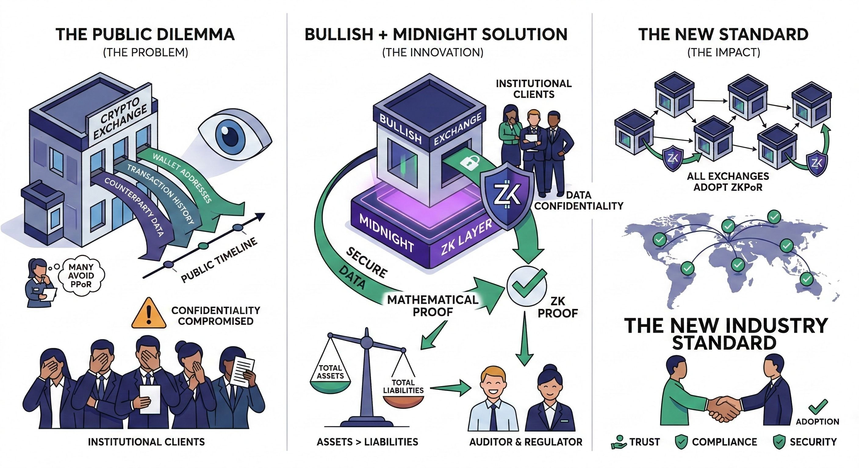 Bullish đang xây thứ khác hơn trên ZK layer của Midnight: chứng minh toán học rằng tổng tài sản lớn hơn tổng liability, mà không cần lộ bất kỳ địa chỉ ví hay tên đối tác nào. Auditor và regulator nhận được bằng chứng đủ để verify, khách hàng institutional không bị expose data. Nếu mô hình này thành công và được adopt rộng rãi, đây không còn là câu chuyện của riêng Midnight hay Bullish nữa — mà là standard mới mà toàn bộ industry sẽ phải follow.