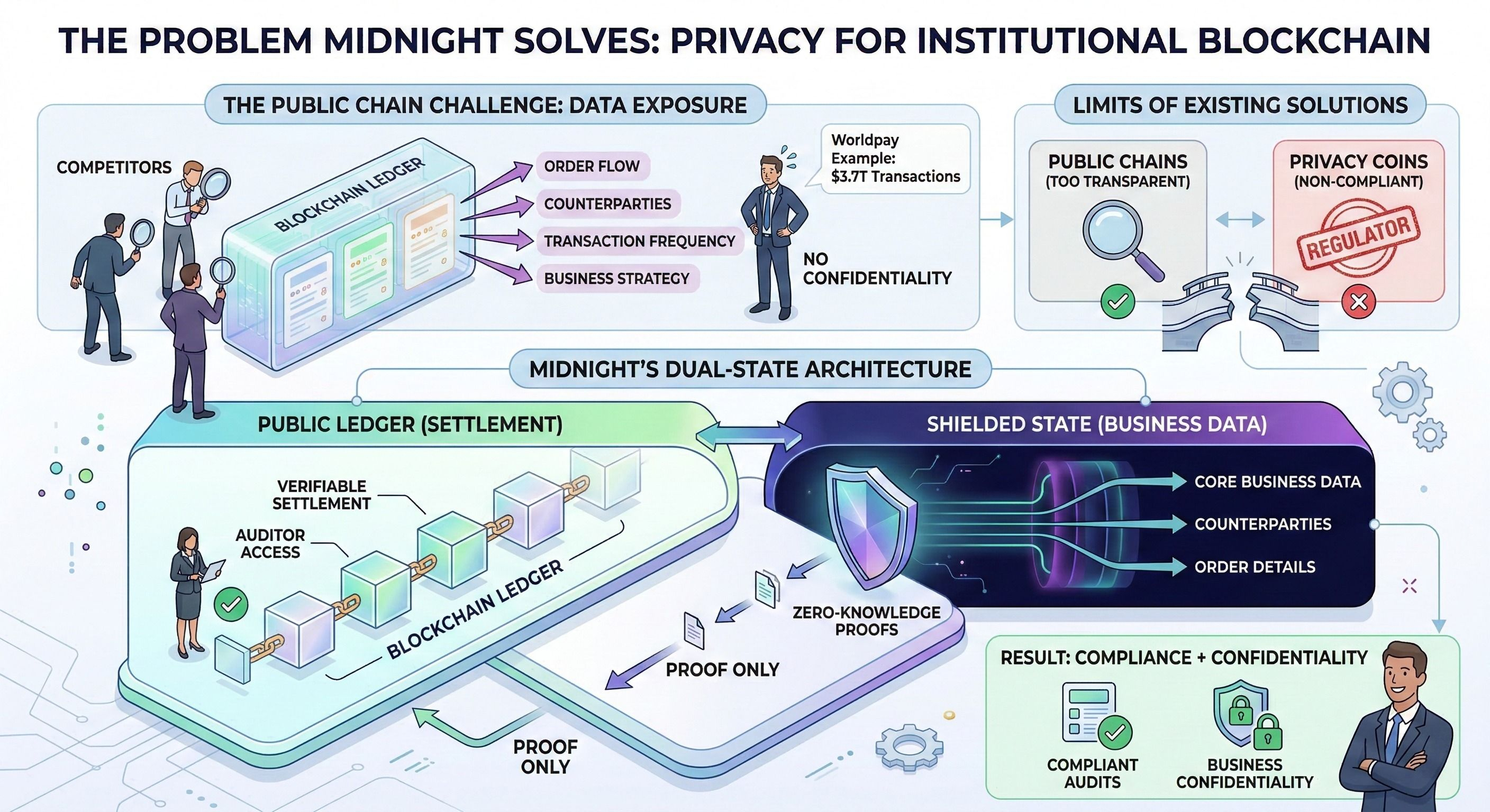 Midnight giải quyết đúng mâu thuẫn này bằng kiến trúc dual-state: settlement vẫn public để auditor và regulator verify được, nhưng dữ liệu nghiệp vụ, counterparty, order flow được shielded hoàn toàn bằng ZK proofs. Bạn chứng minh được compliance mà không cần lộ core business data. Đây là thứ public chain không làm được vì minh bạch là DNA của nó, và privacy coin truyền thống không được phép làm vì regulator gắn nhãn đáng ngờ ngay từ đầu. Midnight đang lấp đúng khoảng trống đó.