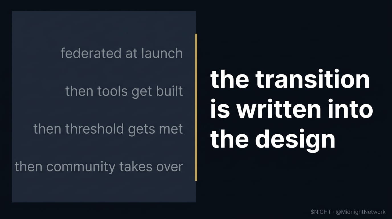 What makes Midnight's approach notable is that the transition path is written into the design. the whitepaper is clear that as the network matures, all components including monetary policy may become subject to change through on-chain governance, provided a predefined voting threshold is met. the federated structure isnt meant to be permanent. its a starting point with an expected end state.