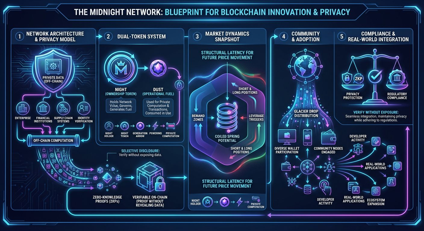 In conclusion, the @MidnightNetwork and $NIGHT represent a thoughtful bet on the future of selective privacy. The project has successfully navigated its early phases, establishing both infrastructure and community. Market dynamics suggest latent energy, a foundation ready for potential growth. Its ultimate success will hinge on the translation of technical capability into user-driven adoption, developer engagement, and ecosystem expansion. For those observing, the prudent path is careful monitoring of these structural indicators, tracking adoption trends, and respecting the signals provided by market behavior. Midnight Network is no longer just a concept. It is a living ecosystem, quietly positioning itself to redefine privacy, control, and value creation in the blockchain space.