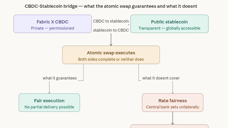 the bridge enables this through atomic swaps. an atomic swap means the conversion happens as a single indivisible operation. either both sides of the exchange complete simultaneously or neither side does. there is no window where one party has handed over value and the other has not yet delivered. the cryptographic guarantee is real and meaningful. users cannot be cheated by a bridge that takes their CBDC and fails to deliver stablecoin.