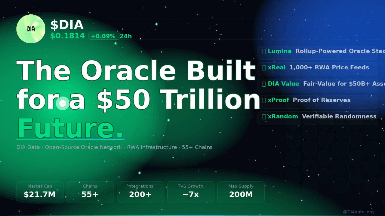 DIA (Decentralised Information Asset) is an open-source oracle network built for the next generation of DeFi—one where assets are priced not just in ETH and BTC but also in tokenized US Treasuries, real estate, fund shares, yield-bearing tokens, and the full spectrum of Real World Assets (RWAs).