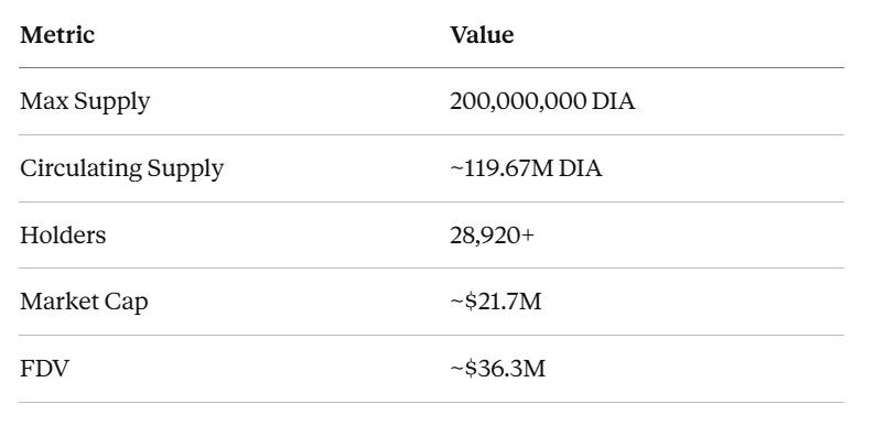 At the time of writing, $DIA trades at $0.1814 — a $21.7M market cap for a protocol that: