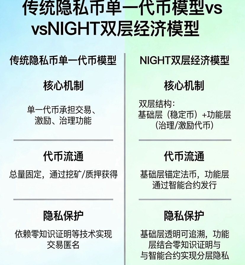 Во-вторых, различия в экономических моделях также очевидны. Традиционные приватные монеты в основном используют однотокеновую модель, где каждое действие пользователя в сети требует непосредственного расхода токенов, что в условиях перегруженности сети или колебаний цен может сделать затраты неконтролируемыми. NIGHT использует более продвинутую двухуровневую структуру: NIGHT как основной актив отвечает за управление и несение ценности, а расход ресурсов осуществляется через другой механизм. Этот дизайн делает затраты на использование более стабильными и более подходящими для долгосрочного развития экосистемы.
