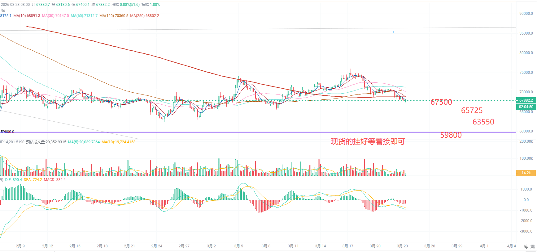 Ключевые уровни сейчас 67500 и 70825, эти уровни всем должны быть знакомы. Сегодня в течение дня внимательно следите за объемом и ценой на этих уровнях, особенно 67500 — будет ли пробой с увеличением объема или же мы коснемся дна и постепенно выйдем на восходящий тренд.