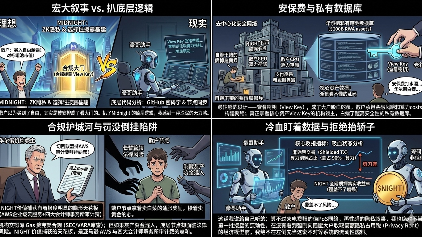 如果在接下来的几个季度里,链上90%以上的节点算力都被几个巨型机构的私密合约霸占,而节点产出的$NIGHT 代币奖励完全覆盖不了硬件磨损和合规风险溢价,那这就是一个典型的大户吸血、散户买单的死局。