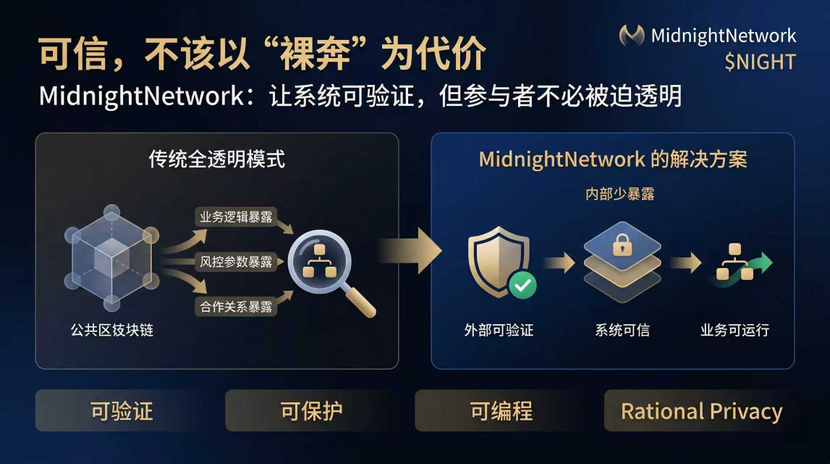 И именно поэтому, когда я снова смотрел на @MidnightNetwork , я заметил не только эти слова о рациональной конфиденциальности, но и то, что он пытается ответить на более сложный и более реальный вопрос: когда мир на блокчейне начинает касаться платежей, идентификации, бизнес-сотрудничества и институциональных бизнесов, можем ли мы добиться того, чтобы система оставалась проверяемой, но участники не были вынуждены быть прозрачными?