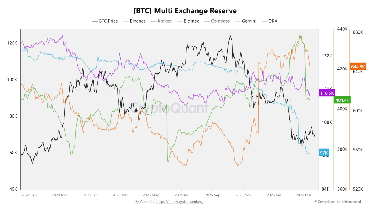 Gemini также зафиксировала значительное сокращение, снизившись с 111K 6 февраля до 97K 14 марта, что составляет чистое снижение на 14K биткойнов.
