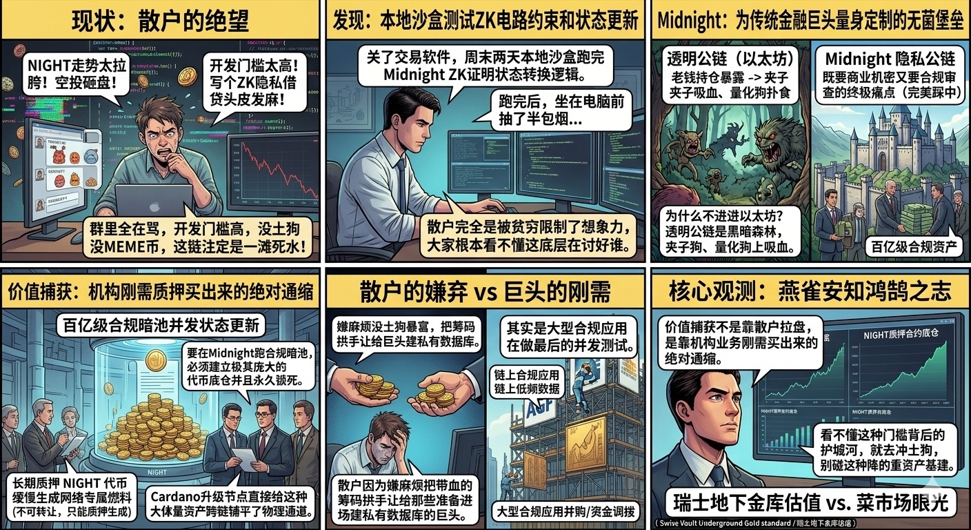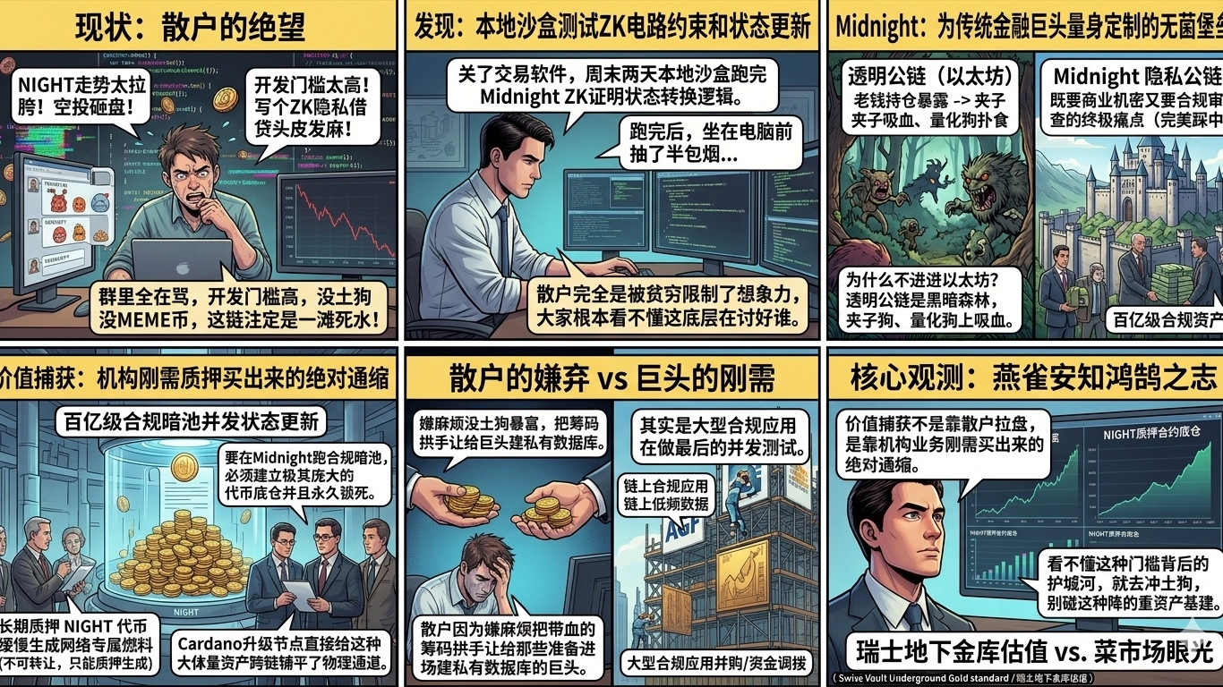 最近这几天群里全在骂NIGHT走势拉胯,说空投砸盘太狠,散户拿不住。我嫌他们吵,直接把交易软件关了,周末花了两天时间在本地沙盒里把@MidnightNetwork 主网上线前的那套零知识证明状态转换逻辑跑了一遍。