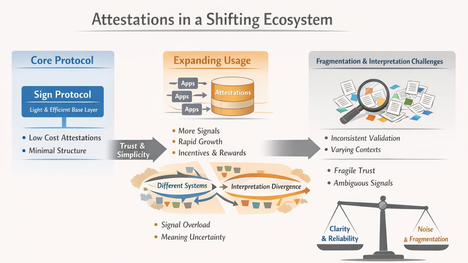 В том, как распределяется ответственность, есть что-то тонкое. Сохраняя минимальным основной уровень, протокол дает свободу приложениям, построенным поверх него. Эта свобода может быть мощной. Она позволяет различным системам определять свою собственную логику, свои собственные правила, свои собственные интерпретации. Но это также означает, что согласованность не гарантируется. Две системы могут по-разному интерпретировать одно и то же свидетельство. Со временем это расхождение уже не ощущается как гибкость. Оно начинает ощущаться как фрагментация.