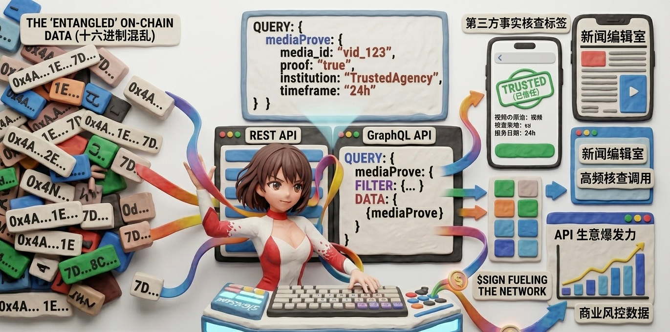 假如某个内容社区的产品经理突然想在帖子下面加个“事实核查”标签,他压根不需要去动后端的屎山代码,更不用去搭什么全节点。直接调 GraphQL 接口,写个极其简单的 Query:把过去 24 小时某机构针对这段视频的溯源证明拉出来。要什么字段就取什么,一点多余的数据都没有。这种拔插即用的爽感,能让任何一个传统的 Web2 平台在几天内接上防伪溯源的管子。