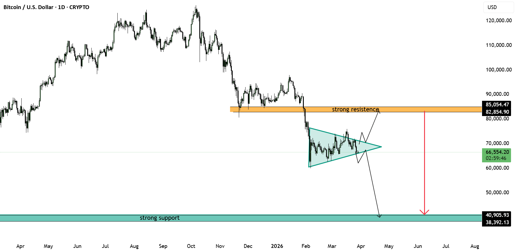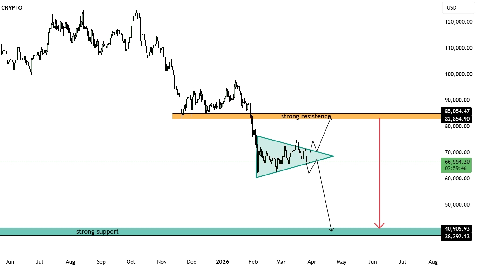 С одной стороны, структура треугольника предполагает потенциальное медвежье продолжение, если поддержка не выдержит. Пробой ниже рисунка может привести к резкому движению в сторону основной зоны поддержки 40,000–38,000, которая является сильной зоной спроса на более высоком временном интервале.