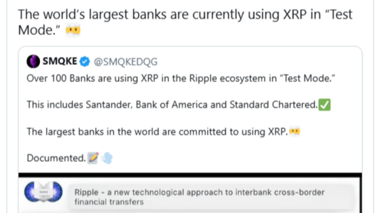 In reiterating the earlier claim, SMQKE pointed to the involvement of several globally recognized banks. The institutions mentioned include Banco Santander, Bank of America, and Standard Chartered. These names were presented as examples within a broader group of over 100 financial entities that have reportedly engaged with XRP in test settings.