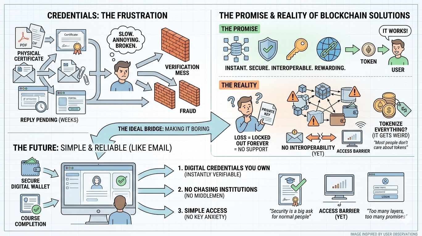 Честно говоря, большинство из этих вещей сейчас сломано. Как будто действительно сломано так, что люди просто принимают это, потому что они к этому привыкли. Вы пытаетесь доказать что-то простое: вашу степень, вашу историю работы, даже вашу личность, и вдруг вы застреваете, имея дело с PDF, электронными письмами, случайными порталами, которые едва работают, и людьми, которые отвечают через недели. Это медленно. Это раздражает. И да, иногда это просто не срабатывает без видимой причины.