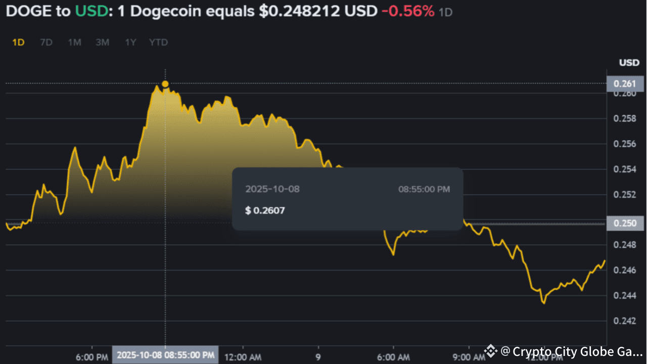 $DOGE попытка превысить $0.26, но сопротивление оказалось реальным. Поскольку начинается продажа прибыли, токен снова снижается, при этом киты все еще тихо накапливают.