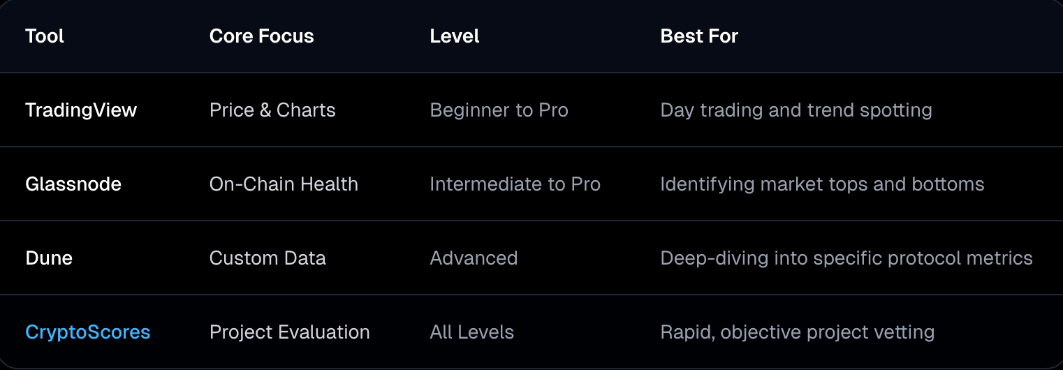 Despite the power of the tools mentioned above, there is a recurring problem: data fatigue. For many investors, looking at a Glassnode chart or a Dune dashboard feels like reading a foreign language. Furthermore, none of these tools easily tell you whether a project is actually a good investment based on a holistic view.