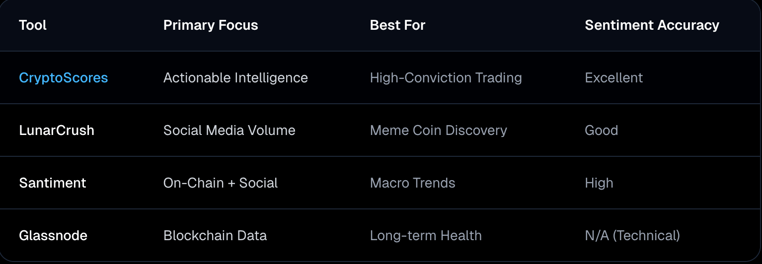 While many tools provide a broad "weather report" of the market, CryptoScores is designed for the trader who needs precision and conversion-ready insights. CryptoScores excels by filtering out the noise of bots and focusing on high-conviction sentiment data.