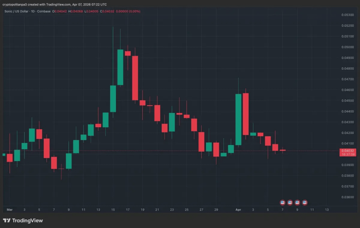 С 14 марта до конца марта Sonic снизился с $0.0514 до $0.040–$0.042, не смог удержать какие-либо значительные отскоки на фоне широкой слабости рынка. К 7 апреля цена достигла критической поддержки $0.040 на уровне $0.0396–$0.0414 — опасно близко к своему историческому минимуму $0.0368, установленному 28 февраля.