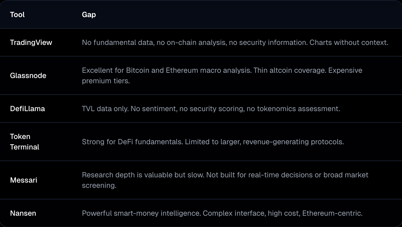 Each of the platforms above is genuinely excellent within its domain. But none of them answers the question an investor most often faces: is this specific crypto worth my money right now?