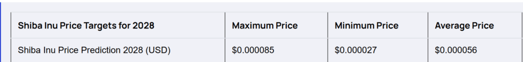 “Таким образом, после рассмотрения всех этих факторов, наш прогноз цен на Shiba Inu на 2028 год в USD составляет $0.000085 (максимум), $0.000027 (минимум) и $0.000056 (в среднем).”