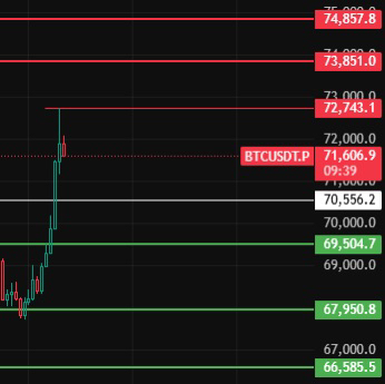 Сегодня обратите внимание на 70550, если откат не пробьёт это место, то бычий тренд останется, продолжим подниматься, сначала смотрим на предыдущий максимум 72740, если не пробьёт, малые уровни всё равно будут откатываться, пробив верхние уровни сопротивления, обратите внимание на 73850-74860-76000!