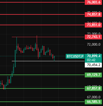 如果今天回踩跌破70450这个位置,那4小时级别开始回调,下方支撑位留意69130-67850-66600这几个位置附近!#BTC走势分析
